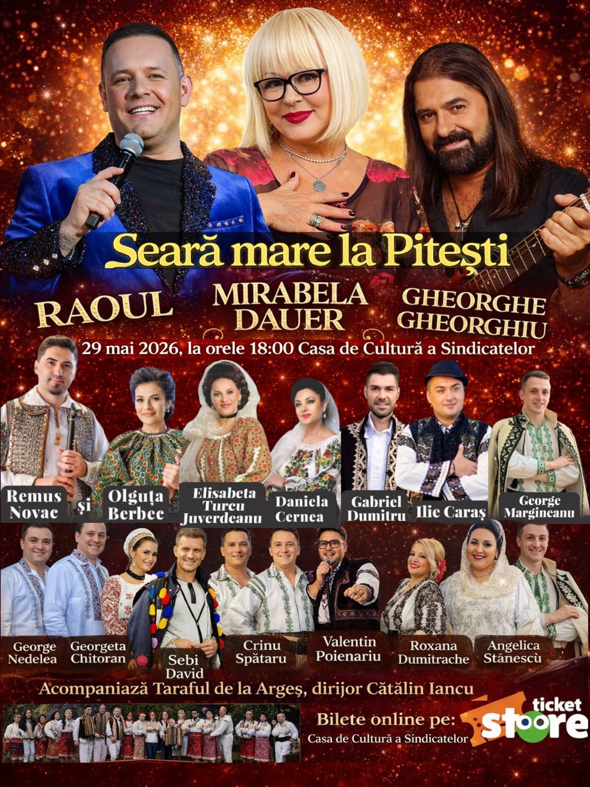 În data de 29 mai 2026, la orele 18:00, va așteptăm la un concert de excepție, care va avea loc la Casa de Cultura a Sindicatelor din Pitești.  Acompaniază Taraful de la Argeș, dirijor Cătălin Iancu Va așteptăm cu drag! Notati-va data în calendar! SEARA MARE LA PITESTI Casa de Cultura a Sindicatelor Pitesti 29 […]